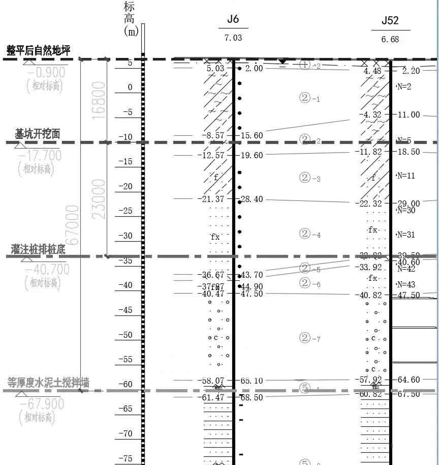 ②-3層粉質(zhì)粘土夾粉土、粉砂:灰色,軟~流塑狀態(tài),土質(zhì)不甚均勻,土切面稍有光澤,無搖振反應,干強度低,韌性低,高壓縮性。