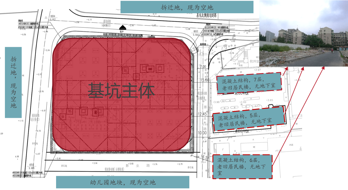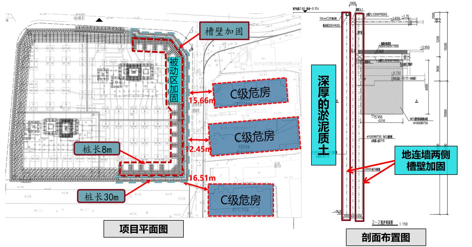 項目開挖深度范圍以及坑底以下都是深厚的淤泥質(zhì)土,距離基坑邊約10米的3幢居民樓為C級危房,原設計采用了灌注樁+三軸止水,結果只打了一幅三軸,坑外民房就沉降了16mm??紤]到對周邊環(huán)境的保護,重新進行專家評審和安全評估后,方案調(diào)整為地連墻+IMS工法作被動區(qū)加固,地連墻兩側的槽壁加固也采用IMS工法。