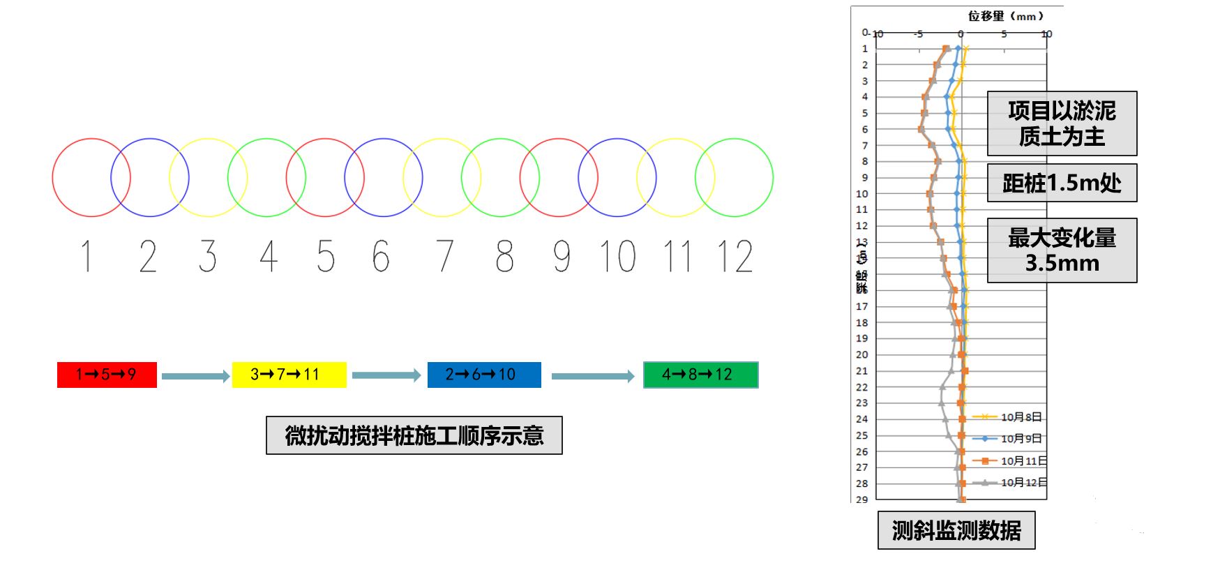 IMS工法最突出的特點就是微擾動,環(huán)境影響小。IMS工法的鉆桿采用的是6邊形鉆桿,所以在鉆桿轉動的時候,鉆桿與孔壁間存在空隙,可以作為自然排漿通道,從而降低地內(nèi)壓力,另一方面,IMS工法注漿壓力很小,只有1Mpa,而且不需要輔助空氣壓力。另外,為了進一步減小施工過程對周圍環(huán)境的影響,我們對于本項目采用了跳樁的形式進行施工,按照159、3711、2610、4812這樣的施工順序進行打樁,距離微擾動攪拌樁中心1.5m處我們設置了測斜孔。經(jīng)監(jiān)測,施工前后最大位移變化量控制在了3.5mm以內(nèi)。