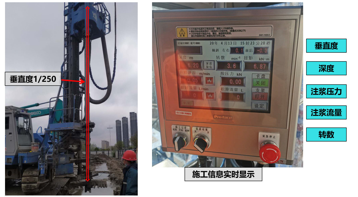 IMS工法施工精度高,操作室內(nèi)可以實時監(jiān)控鉆桿垂直度、深度、注漿壓力、注漿流量、轉數(shù)等情況;保證了在大深度的基坑工程中也能做到高精度高質(zhì)量施工。