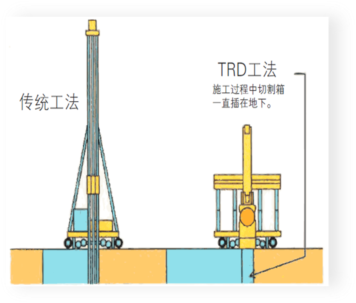 TRD工法,被稱(chēng)為等厚水泥土連續(xù)攪拌墻工法,由浙江吉通地空建筑科技有限公司在2009年國(guó)內(nèi)首次引進(jìn)研發(fā),是將滿(mǎn)足設(shè)計(jì)深度的附有切割鏈條以及刀頭的切割箱插入地下,在進(jìn)行縱向切割橫向推進(jìn)成槽的同時(shí),向地基內(nèi)部注入水泥漿以達(dá)到與原狀地基的充分混合攪拌在地下形成等厚度連續(xù)墻的一種施工工藝。