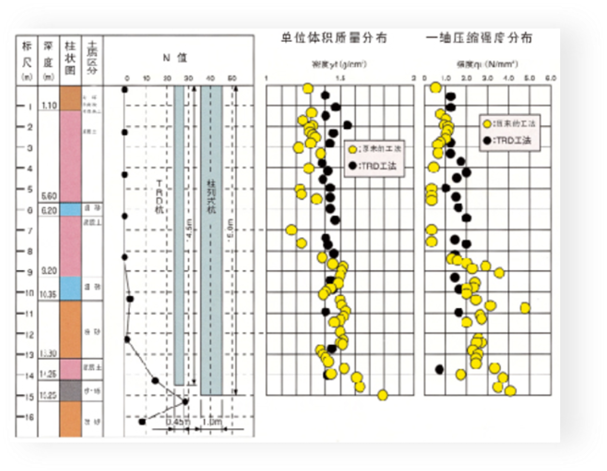 IMS工法空攪時(shí)不噴射水泥漿,能有效節(jié)省水泥用量;且由于穩(wěn)定、高精度的施工機(jī)械及可靠、高效、高質(zhì)量的施工管理,能夠在埋深較大處成高質(zhì)量的樁體,起到良好的深層土體加固的效果。
