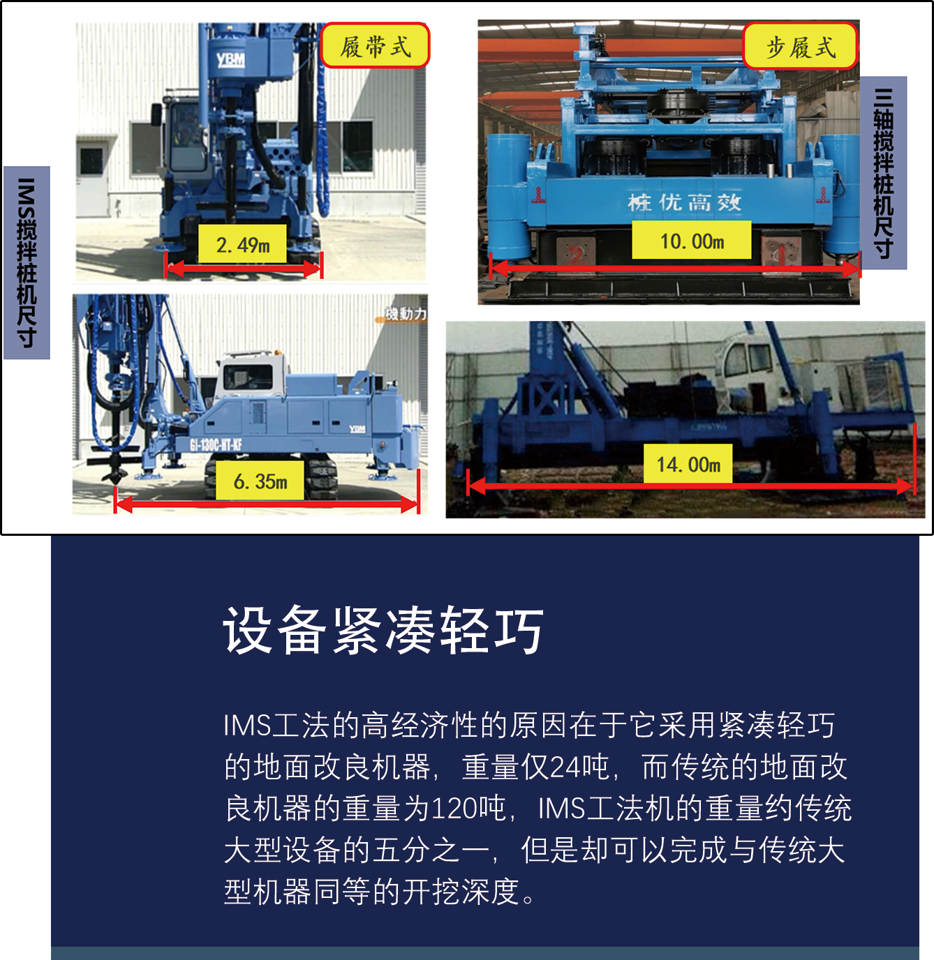 根據(jù)目前我國(guó)地下空間發(fā)展需要,結(jié)合國(guó)際先進(jìn)理念,吉通地空科技引進(jìn)了全國(guó)首臺(tái)IMS工法機(jī)。IMS工法又稱(chēng)為微擾動(dòng)攪拌樁工法,該工法機(jī)功率大,自重僅25噸,設(shè)備占用空間小,流動(dòng)性好,且施工效率高,施工擾動(dòng)小,響應(yīng)微變形施工理念。該工法目前已經(jīng)被應(yīng)用于場(chǎng)地狹小工程及周邊環(huán)境敏感工程(如地鐵、危房、文保邊等)的地基處理、道橋加固、深基坑止水、地連墻槽壁加固等諸多領(lǐng)域,并取得了良好的施工效果。