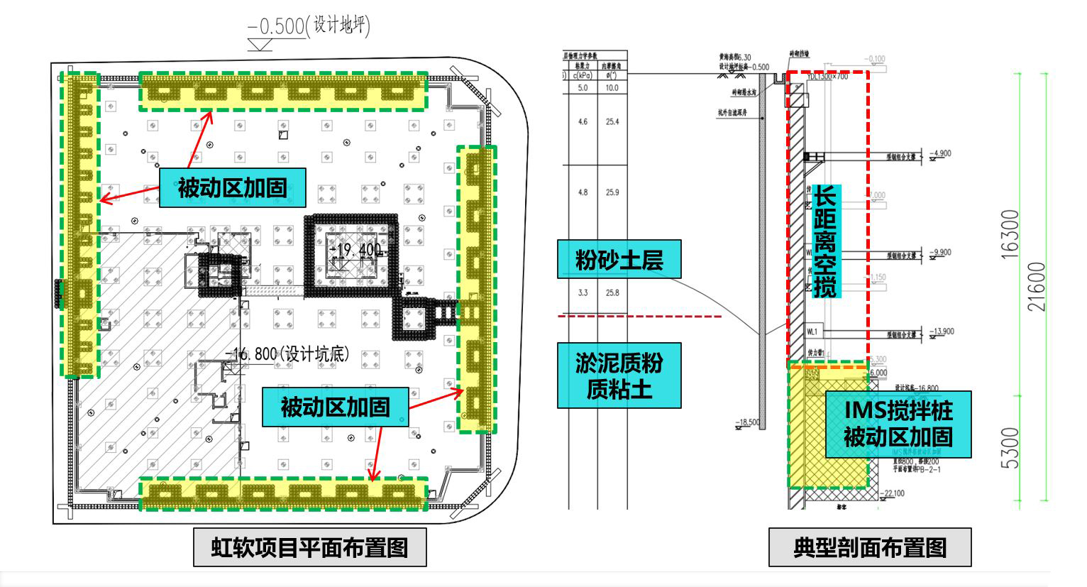 虹軟視覺(jué)人工智能產(chǎn)業(yè)化基地項(xiàng)目工程位于市濱江區(qū)濱興路與江淑路交叉口,基坑開(kāi)挖深度約為16.3m,電梯井深坑高差3.4m。由浙江吉通進(jìn)行施工,采用TRD工法兼作支護(hù)結(jié)構(gòu)和止水帷幕,坑內(nèi)設(shè)置IMS攪拌樁被動(dòng)區(qū)加固和重力式擋墻,設(shè)置一道鋼筋砼支撐和三道預(yù)應(yīng)力型鋼組合支撐的圍護(hù)方式。