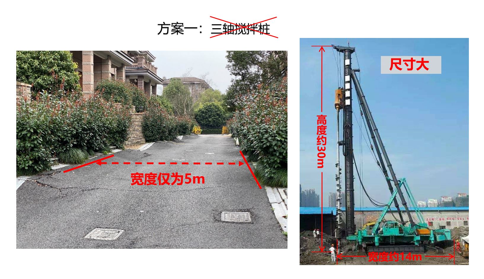 最先被排除的是三軸水泥攪拌樁,由于三軸設備尺寸太大,而小區(qū)內(nèi)部道路普遍只有5~8m寬,所以不具備施工條件;