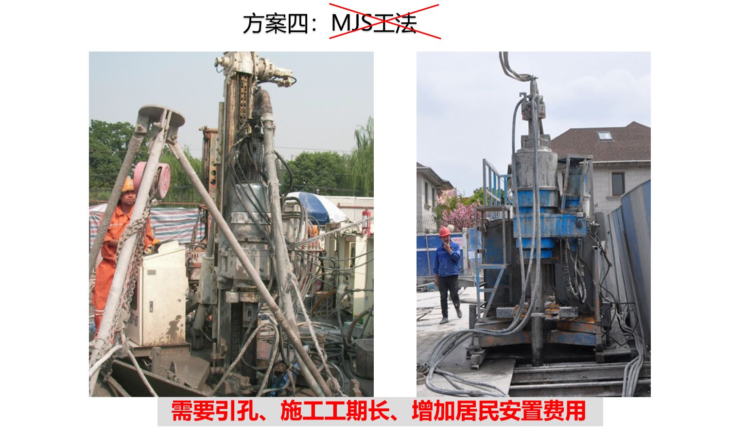 最后是MJS工法,這種工藝設備輕、擾動小、質(zhì)量好,但是造價相對比較高,而且由于MJS施工前需要引孔,施工工期比較長,也會進一步增加小區(qū)內(nèi)居民的安置費用。