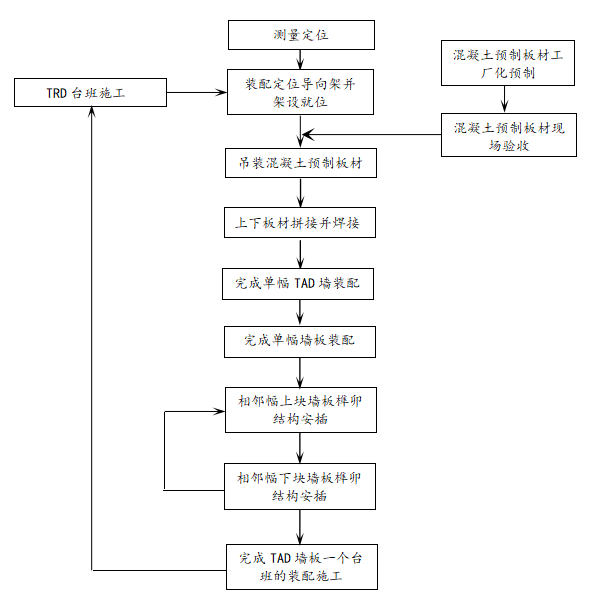 測量定位﹥TRD臺班施工(先行)﹥裝配定位導向架并架設就位﹥混凝土預制板材現場驗收﹥吊裝混凝土預制板材﹥上下板材拼接并焊接﹥完成單幅TAD墻裝配﹥相鄰幅上下塊板材榫卯結構安插﹥完成TAD墻一個臺班裝配施工并進行下一循環。