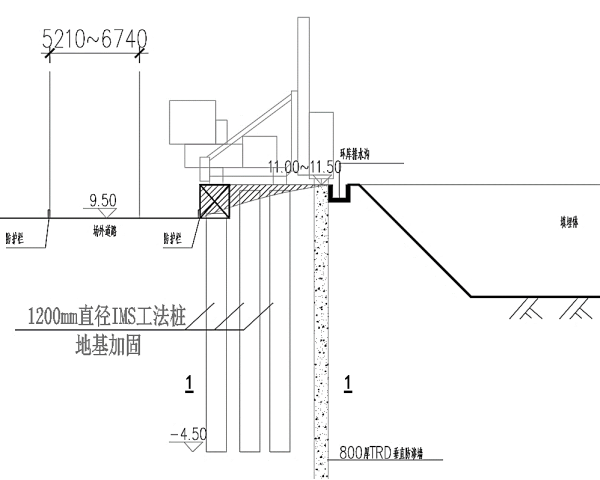 項目北側東段現狀行車道路與填埋場間存在一定的落差,落差為0.5m-2.7m,原先設置了鋼筋砼擋墻進行支擋;由于落差較大,考慮到TRD機械直接進行施工,會有傾覆的風險;且本項目對TRD施工質量要求高,直接進行施工不利于控制水泥土連續墻的施工質量。故在該區域,先采用IMS工法樁進行了復合地基加固后,再進行TRD施工。