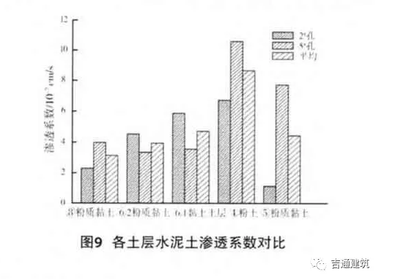 從滲透系數(shù)范圍可以推測:在黏土、粉土、以及粉質(zhì)黏土層范圍內(nèi),經(jīng)TRD工法作用,使該范圍土層得到充分攪拌,上下基本均勻一致,未出現(xiàn)黏土成塊和局部漿液富集的現(xiàn)象,水泥攪拌土結(jié)構(gòu)致密。經(jīng)試驗分析,水泥攪拌土滲透系數(shù)均在10^(-7)數(shù)量級,同土層施工效果的平均性較好。